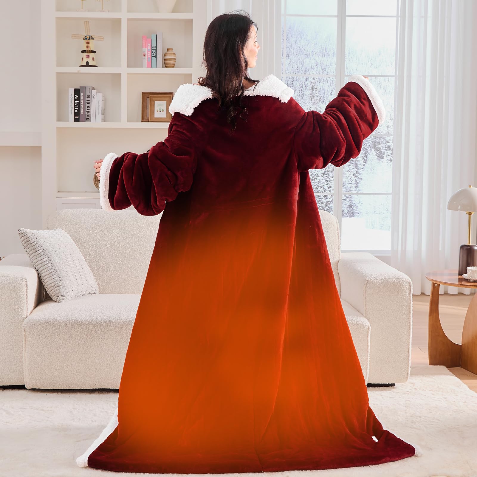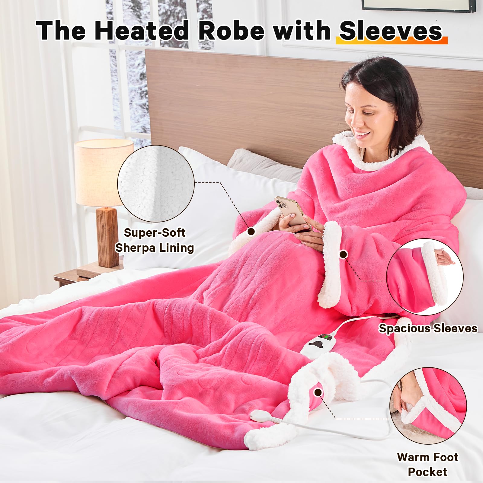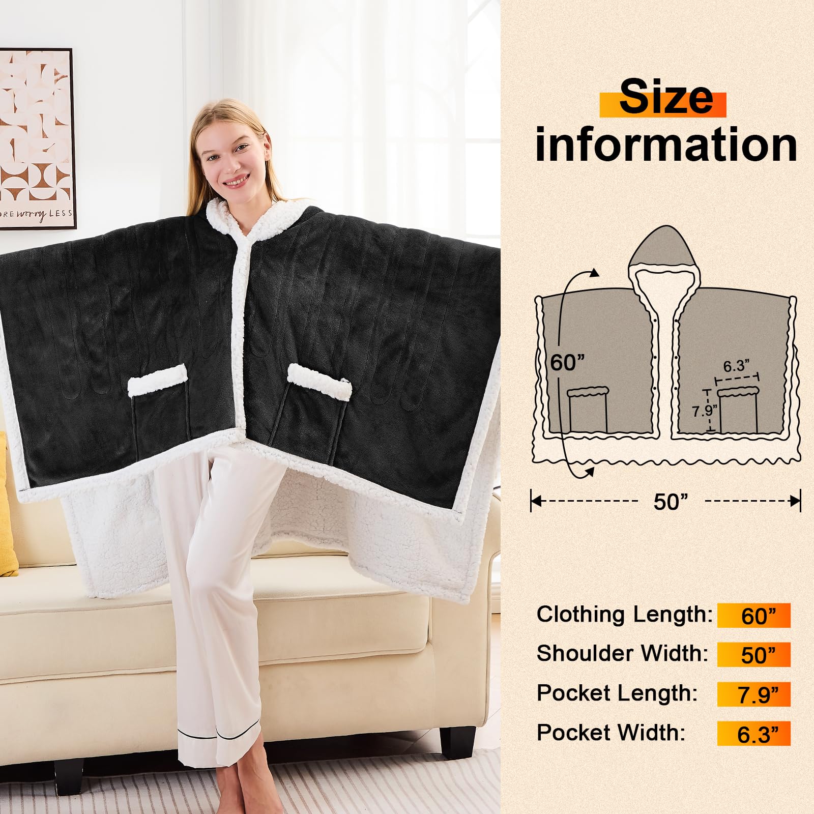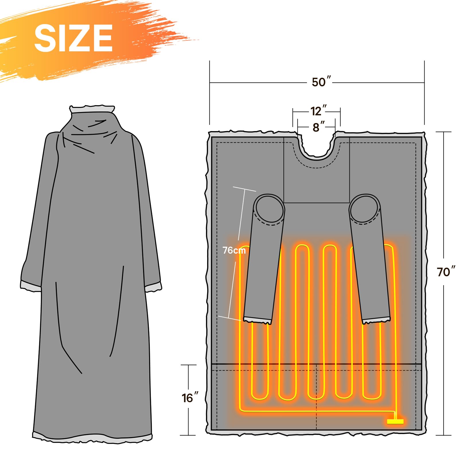 - Full-Coverage Heated Blanket with Sleeves & Foot Pocket – Measuring 70" x 50", this oversized wearable blanket design wraps you in head-to-toe warmth. The 29.2" long sleeves keep your hands free for multitasking—whether it’s reading, gaming, typing, or scrolling—while the extra-deep 16" foot pocket gently cradles your feet in lasting warmth, preventing them from slipping out or getting cold. Wear it forward or backward for cozy flexibility in any position