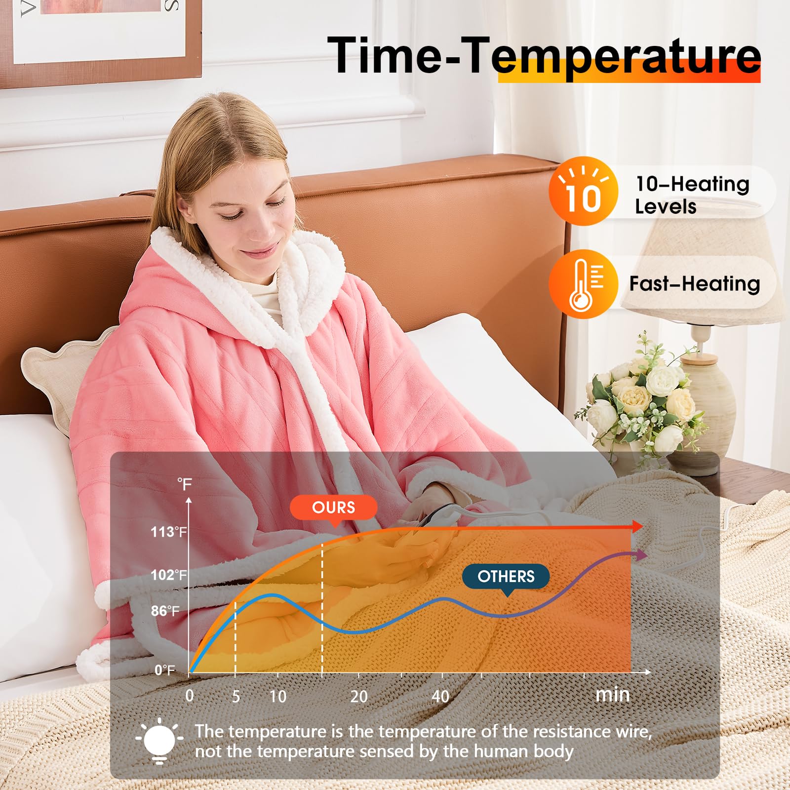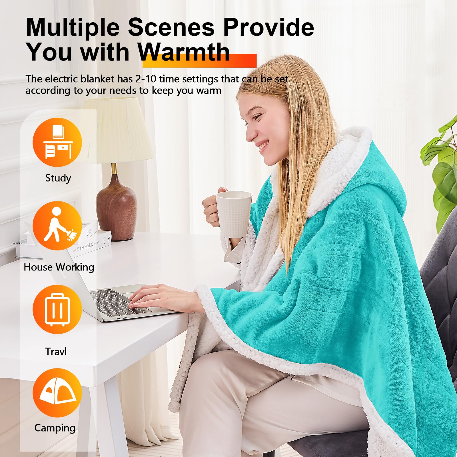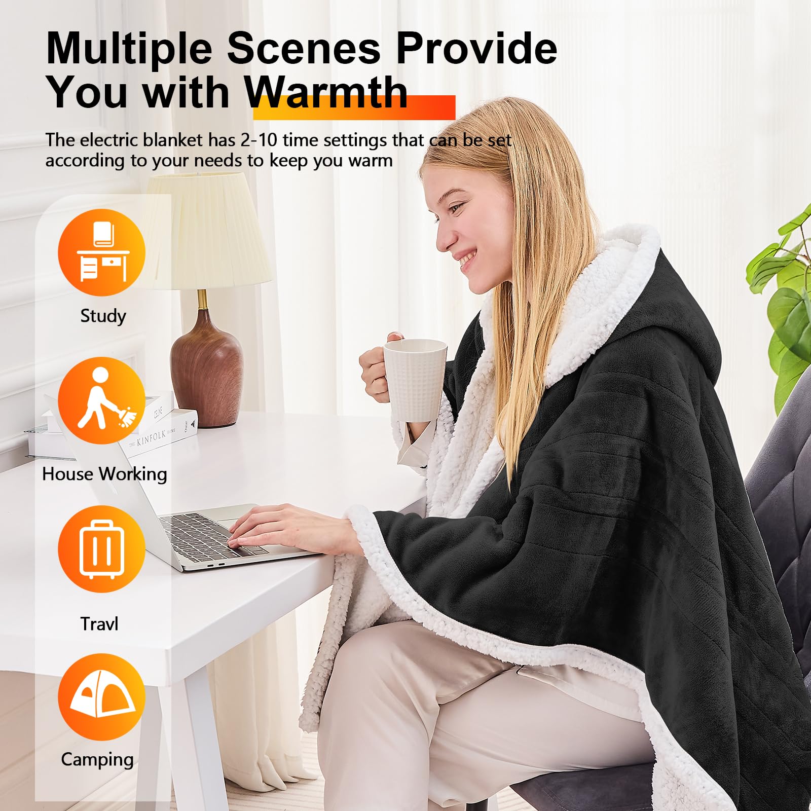 - Customizable Comfort:Our wearable heated blanket offers 10 heat settings (86°F–131°F) so you can find the warmth that feels just right. It also features 5 auto-off timers — 1, 2, 4, 6, or 8 hours — giving you peace of mind while you relax. Simply choose your preferred temperature and timer, and the blanket will automatically shut off when the time is up